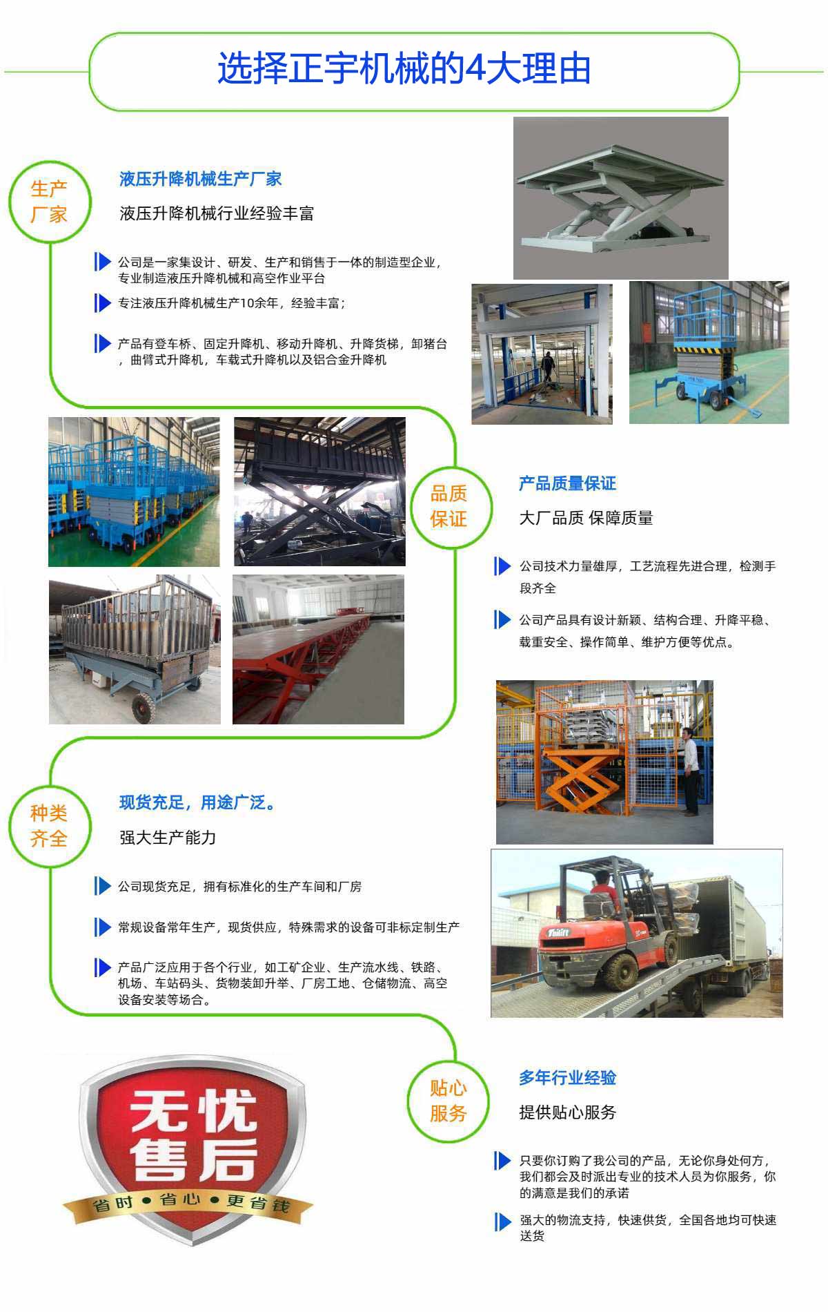 濟(jì)南正宇升降機(jī)械有限公司是一家集設(shè)計、研發(fā)、生產(chǎn)和銷售于一體的制造型企業(yè),生產(chǎn)液壓升降機(jī)械和高空作業(yè)平臺,公司處于素有泉城美稱的山東省濟(jì)南市,坐落于濟(jì)北開發(fā)區(qū)。優(yōu)越的地理位置和便利的交通給公司的發(fā)展帶來了充分的條件。正宇液壓技術(shù)力量厚,工藝流程先進(jìn)合理,檢測手段齊全。目前主要產(chǎn)品有:高空作業(yè)平臺、登車橋、固定升降機(jī)、移動升降機(jī)以及鋁合金升降機(jī)等等。公司產(chǎn)品具有設(shè)計新穎、結(jié)構(gòu)合理、升降平穩(wěn)、載重安全、操作簡單、維護(hù)方便等優(yōu)點。產(chǎn)品廣泛應(yīng)用于各個行業(yè),如工礦企業(yè)、生產(chǎn)流水線、鐵路、機(jī)場、車站碼頭、貨物裝卸升舉、廠房工地、倉儲物流、高空設(shè)備安裝等場合。公司以誠信、創(chuàng)新、穩(wěn)健為宗旨,以品質(zhì)、完善服務(wù)的理念,迎接市場的挑戰(zhàn)。期待您的咨詢!